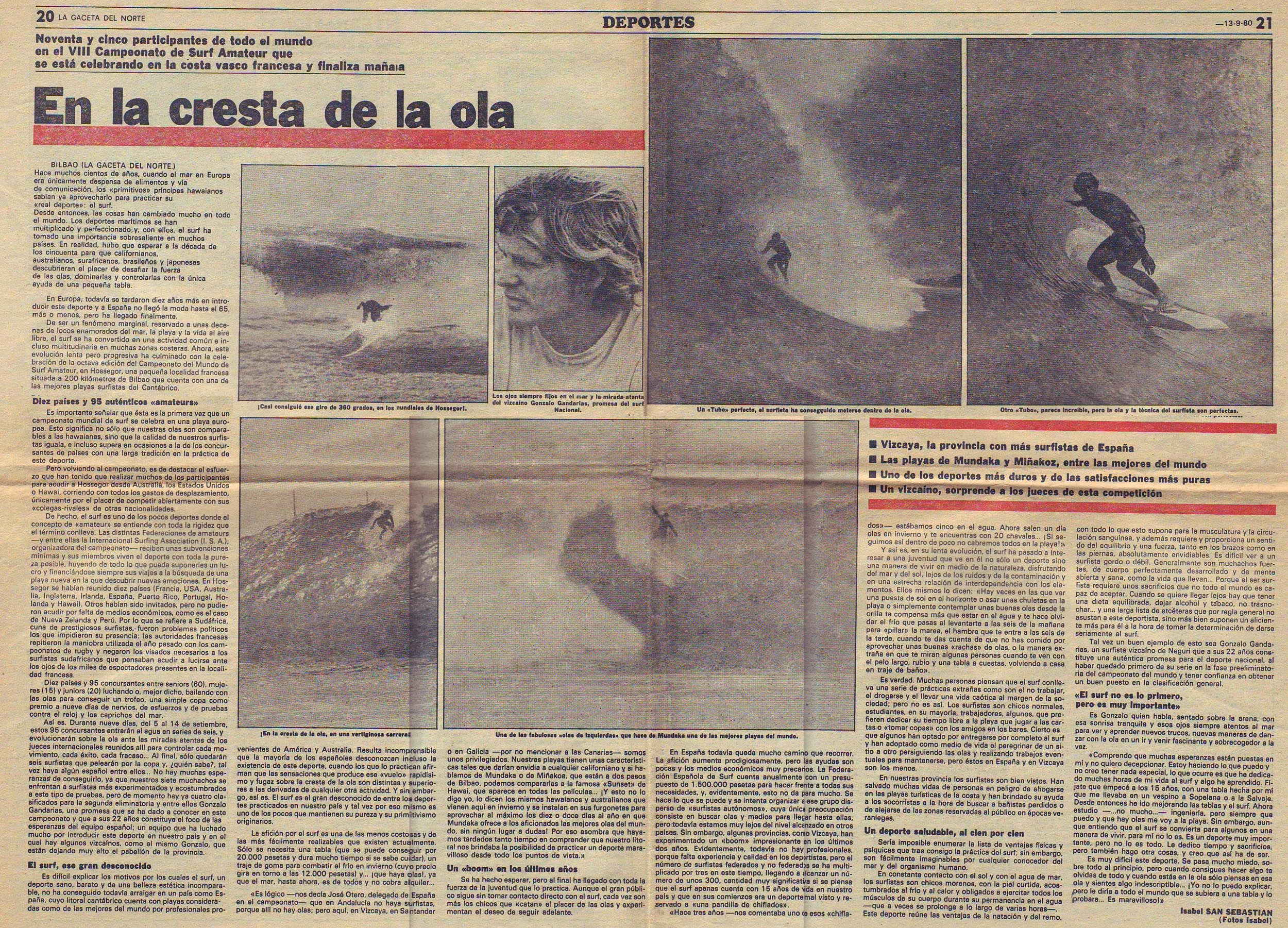 AQUELLOS MARAVILLOSOS AÑOS: En la cresta de la ola Publicado por: Rafa Aspiunza 2 junio 2015 Articulo de la Gazeta del Norte – Septiembre 1980 – (Cedido por Berni Mesanza) Pinchad sobre el artículo para ampliarlo y leedlo